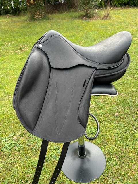 Avec ses grands quartiers, son siège creux, ses généreux taquets évolutifs en épaisseur, ses couteaux d’étrivières reculés, elle permet aux cavaliers et cavalières un appui facile pour une monte en suspension. Ces panneaux usinés mécaniquement, parfaitement symétriques permettent une répartition optimale des pressions sur le dos du cheval. Grâce aux mono-quartiers intégrés, les frottements de vos jambes seront diminués. Son amortisseur intégré de 8mm d’épaisseur joue un rôle prépondérant sur les longues séances de travail. Le sanglage en V permet un maintien optimum de la selle.